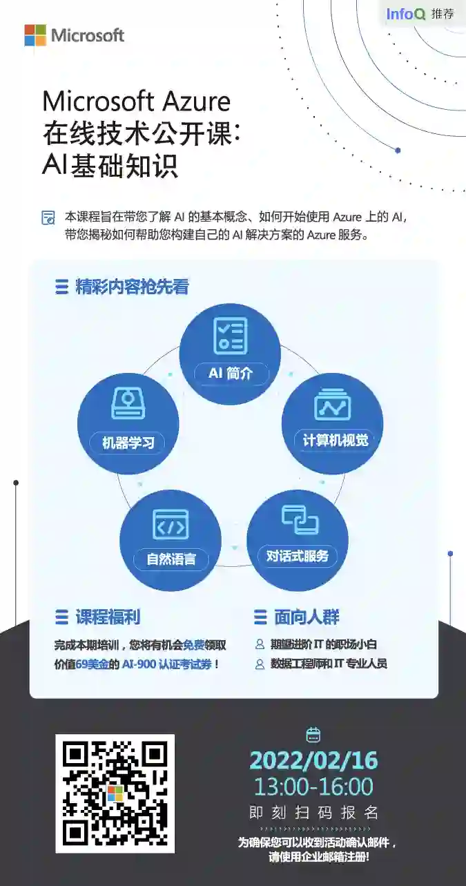 为了帮助广大渴望进阶的职场小白扫除进阶障碍,帮助数据工程师和 IT 专业人员建立更为系统的认知,微软即将在 2022 年 2 月 16 日 13:00-16:00,推出《Microsoft Azure 在线技术公开课: AI 基础知识》,带领渴望进阶的开发者一起突破 AI 基础知识关卡。