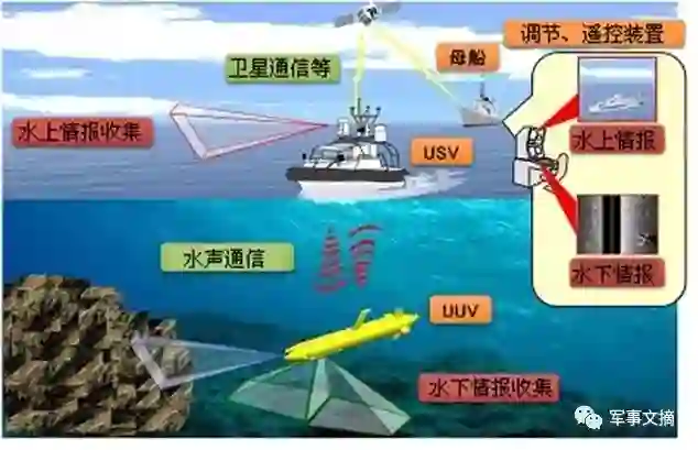 反潜战 无人潜航器在反潜战中可作为潜艇的外部水声传感器平台,执行情报、监视与侦察任务;并可将敌军潜艇引诱至火力攻击范围内增强打击能力;还可作为潜艇远距离的通信中继站。