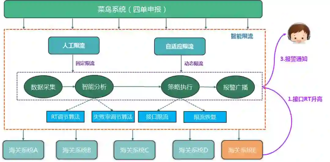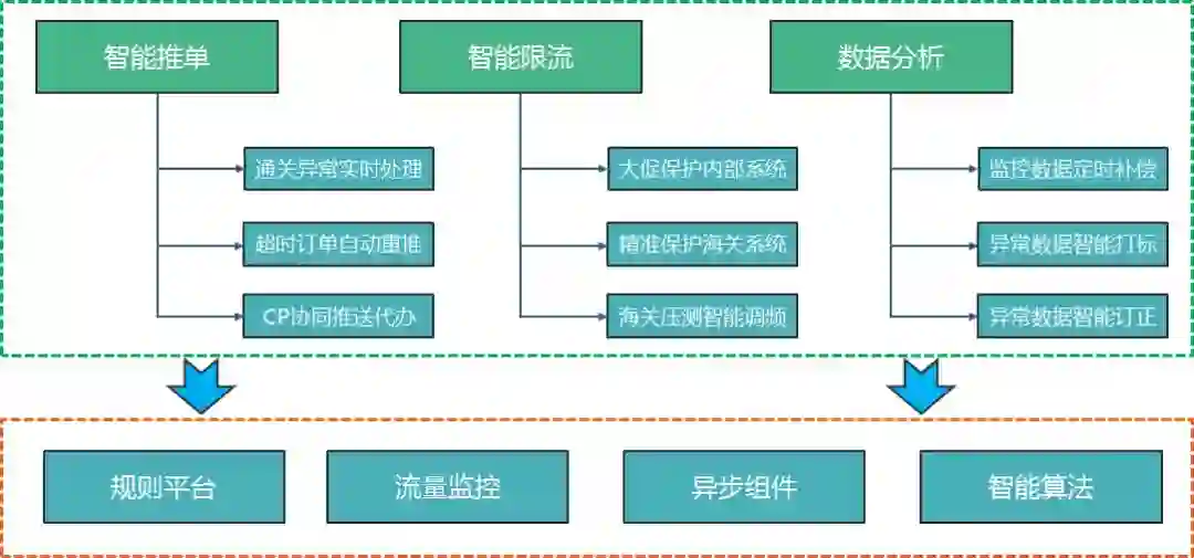 今年是关务的智能化元年,在正向申报链路上,我们推出了智能限流与智能hold单产品,自适应保护自身与海关系统。在人工成本降低的同时,保证了海关系统的最大吞吐能力。在异常处理上,我们基于规则引擎上线了异常智能处理系统,通过不断丰富异常处理规则,系统变得越来越聪明,基本上可以自动处理大部分海关异常。同时,作为关务智能大脑,还为关务数据中心提供数据分析服务。智能系统包含产品如下: