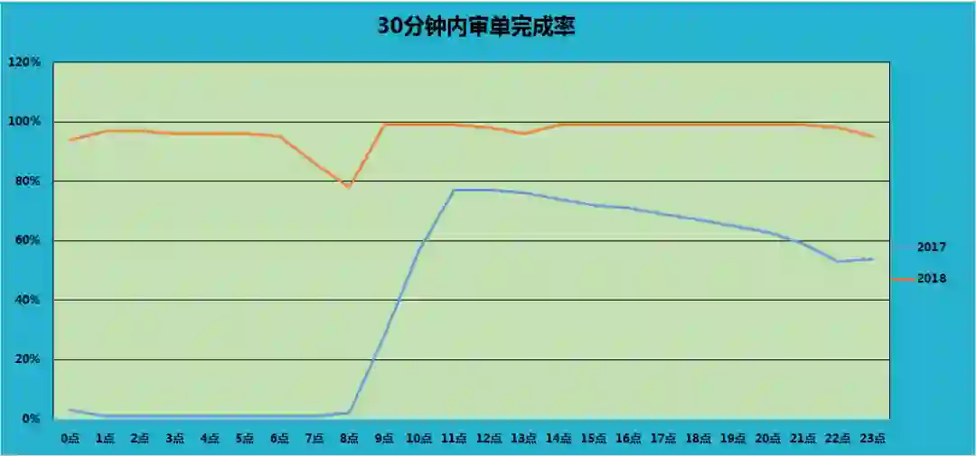 这次微小的调整,却带来了巨大的性能提升,在今年双十一大促上,批量申报也是大放异彩,整个通关审单时效大大降低,申报能力相比往年也有质的提升。如下是17年和18年双十一某一属地海关的平均审单时效对比,相比17年,今年的平均审单时效非常稳定,基本保持在20分钟以内,海关上行和下行通道毫无压力。
