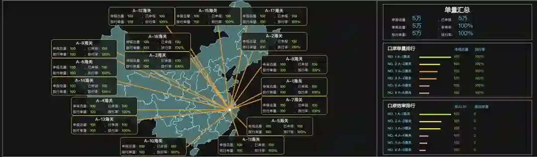 整个通关链路长,依赖系统多,如果有一个全链路的监控系统进行护卫,不仅可以实时窥视整个链路流转情况,还可以做到异常的实时跟踪处理。为此,我们搭建了关务数据中心,承载关务所有数据,并依托它构建了整个星宫大盘产品,将业务监控,指标监控,系统监控一体化,真正实现360度无死角主动监控。如下图(注:下图中数据非真实数据,仅做示例):