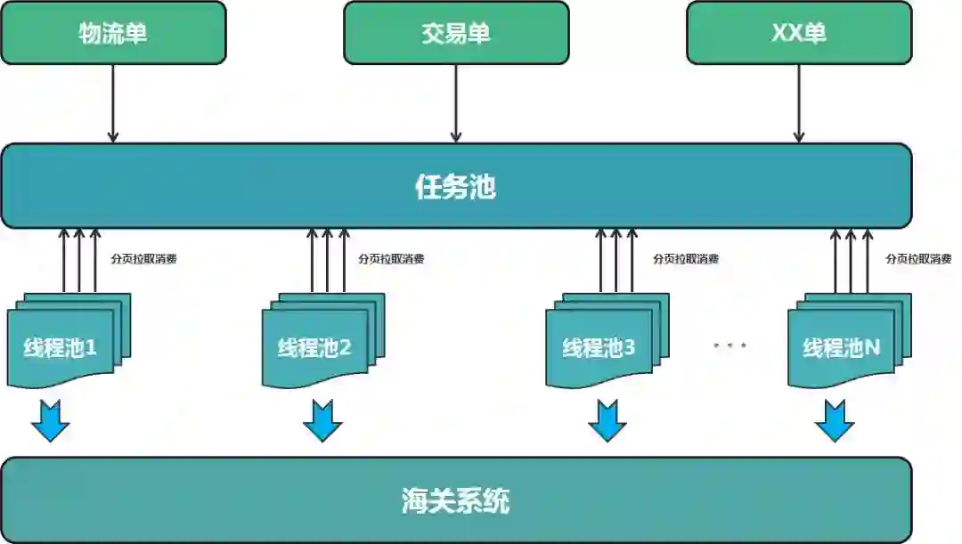 批量申报调度模块自研了一个轻量的批量调度框架实现,通过一个任务池汇总所有任务,按照不同业务规则聚合同类型的任务然后进行消费。如下: