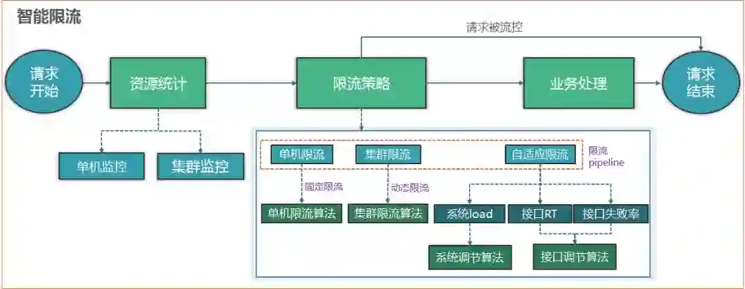 智能限流分三个主要模块:资源监控(对资源的请求量精准统计)、限流策略(请求量达到阈值后的操作)、智能调控(依据一定的规则与算法调节)。