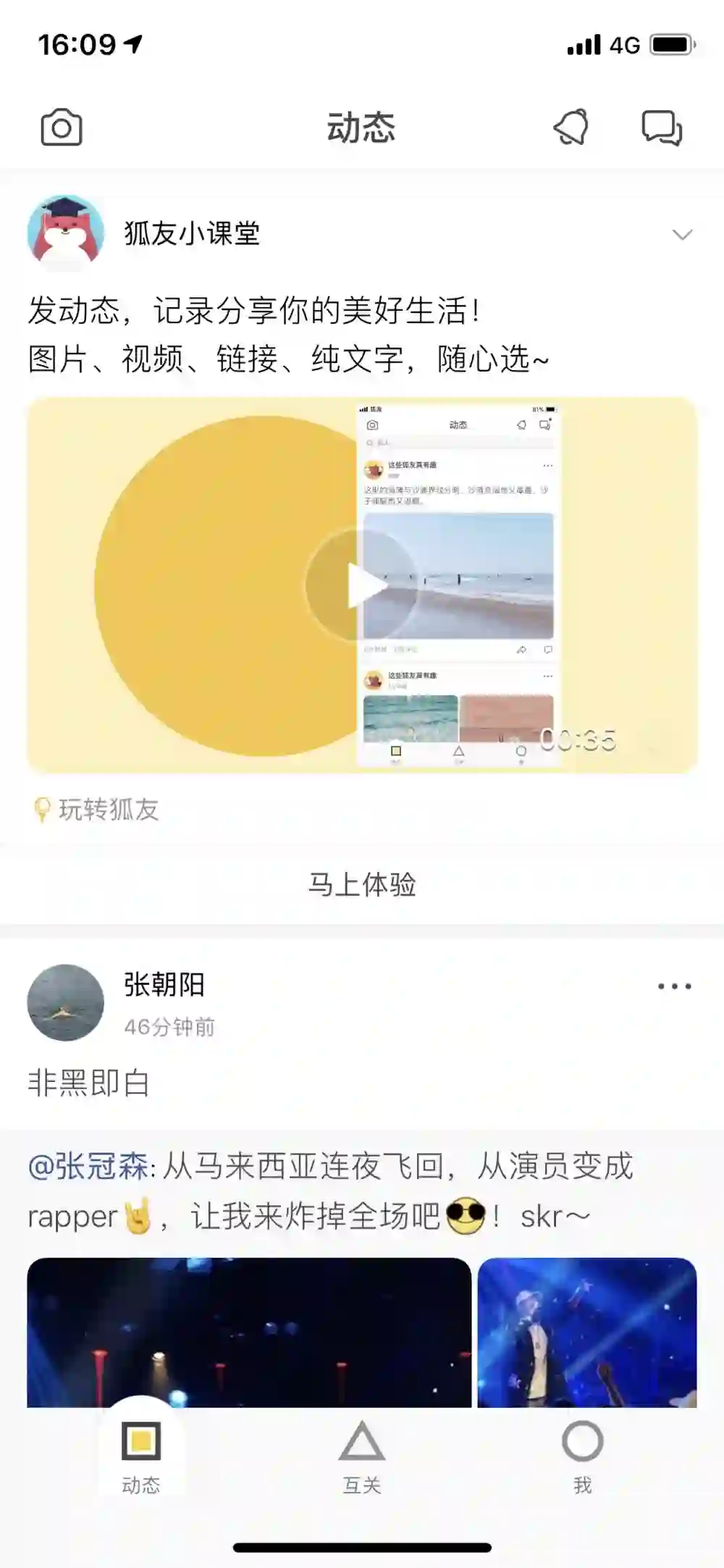 进入产品页面,首屏是动态,主要来自用户关注的用户的分享;右侧两个标签分别为“互关”和“我的”。张朝阳表示:“在狐友没有错乱的时间线,不靠算法推荐,不做“加V”认证,只依赖靠个人的活跃度决定内容的曝光度,保证用户信息流的高效。”
