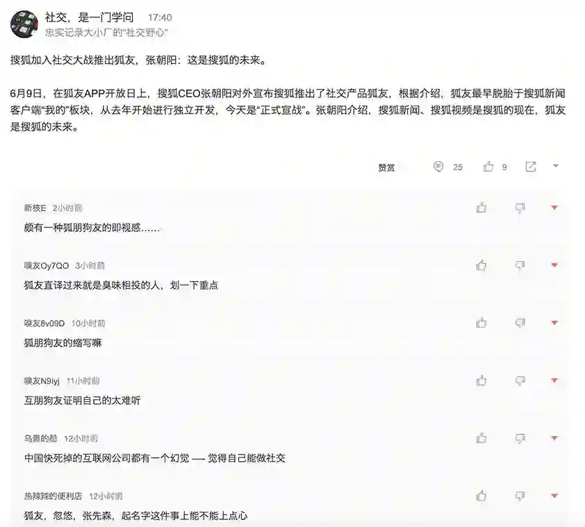从虎嗅24小时的评论区可以发现, 大家对“狐友”这个名字颇有意见。狐友谐音“忽悠”,听起来又像是“狐朋狗友”的简称。作为一款产品的名字,多数人认为“狐友”并不合适。