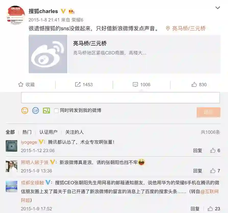 “抱憾!本来微博没有新浪什么事儿的,这个机会应该是搜狐的,我要把江山给夺回来!”