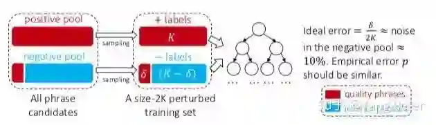 构建多组基本的分类器,分别从Positive Pool和Negative Pool中随机抽取出K个candidates全部,而在负样本中存在perturbed training set见图中的δ,为了尽可能低的降低训练误差的基础分类器,构建一颗未进行剪枝的决策树的方式,当在perturbed training set中没有两个positive和negative phrase共享相同的特征值时,我们认为此时的决策树可以达到100%的训练准确率。最后通过ranking的方式输出排序的结果。