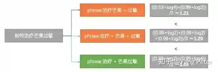 其中新生儿急性鼻炎是一个名词短语(NP),是由NN + JJ + NN组成的,因此传统的方式是根据POS规则模版[3]对phrase进行提取,但是实际操作中存在一些问题,如果直接使用corenlp的浅层句法分析的结果并不是很好,比方说"如何治疗花粉过敏"这句话中的Phrase应该是花粉过敏,但是治疗和花粉合并成了动词短语。但是如果要穷尽所有的POS pattern,并不是一件容易的事情,而且pattern之间可能会存在一些冲突,于是pattern之间排序又成了另一个坑。