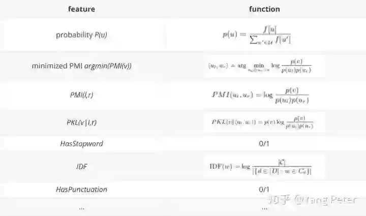 于是接下来的工作中,根据频繁短语监测生成短语候选集,再根据人工筛选出的高质量的短语使用RandomForest构建分类器模型,实验中发现选择200-300个数据就可以满足分类结果。其中特征选取如下表所示:
