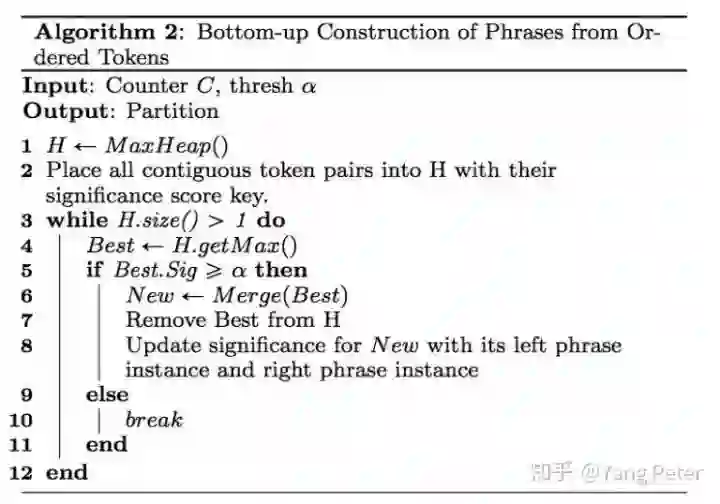 在Phrase Mining中,根据上下文信息衡量合并后的score,判断是否对token进行合并,伪代码如下所示:
