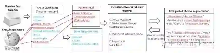 如上图所示,根据frequent n-gram抽取phrase Candidates根据远程监督的方式,根据wikipedia进行过滤筛选出Positive Pool和Noisy Negative Pool,对于Positive Pool来说,其信源比较准确,于是Positive Pool的抽取结果肯定是置信度极高的,而Negative Pool是存在噪音的,因为可能有一些Phrase不存在WikiPedia中,因此文中提到用一种集成学习的方式降低噪音。