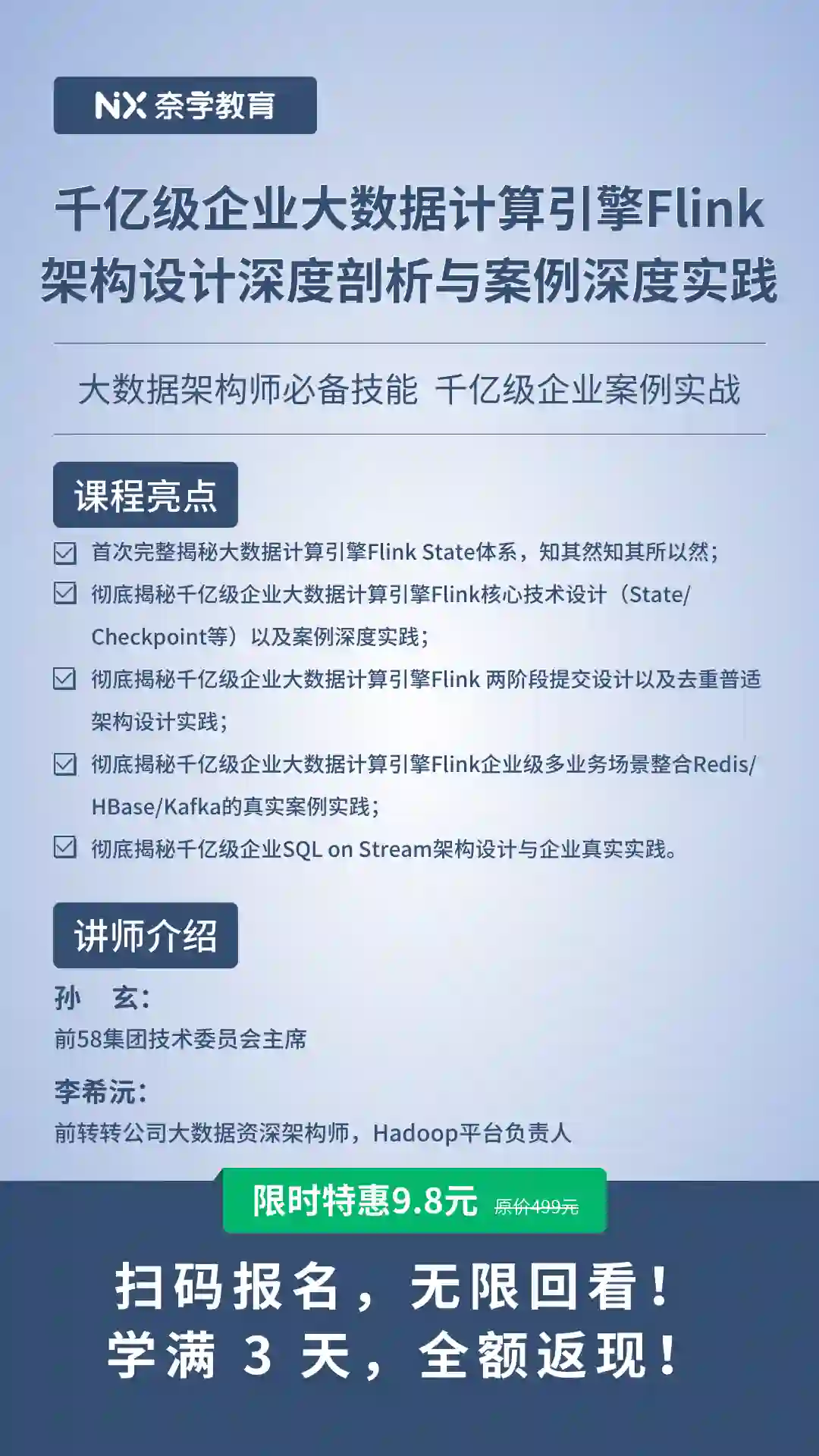 精品在线专栏课原价499,现在花9.8就能拿下,关键是还全额返现!16节名师精心打磨的百万年薪架构师技术和思维模型实战课,等于免费送你!12月8日-10日,3天速成,晚20:00-21:30点,绝对是市面超高质量的Flink计算引擎架构设计实战课,也是大数据架构师必须掌握的核心能力!