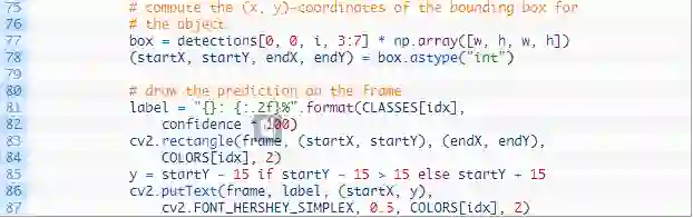 然后,回到 Ezekiel 的第一个问题,我们可以忽略 INGNORE 集合中的类别(#72—73)。如果这个类别是要被忽略的,我们只需返回到顶部的检测循环(不会显示这个类别的标签或边界框)。这符合我们的「quick hack」解决方案。