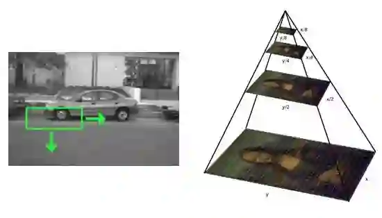 图 2:非端到端深度学习的目标检测器使用一个滑动窗口(左)+图像金字塔(右)相结合的方法来分类。