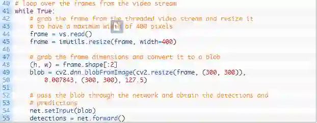 第 48 行和 49 行从这一帧中生成 blob。要了解更多 blob,以及如何使用 cv2.dnn.blobFromImage 函数构建 blob,请在以前的博文中查看所有细节(https://www.pyimagesearch.com/2017/11/06/deep-learning-opencvs-blobfromimage-works/)。