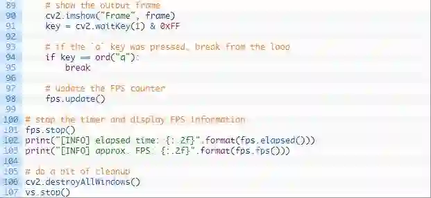 然后我们将 VideoStream 对象实例化为 vs,并开始 fps 计数(36-38 行)。2 秒钟的 sleep 让我们的摄像头有足够的预热时间。