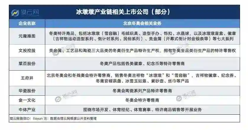 截至2021年底,北京冬奥组委共征集特许生产企业29家、特许零售企业58家,不乏安踏体育、元隆雅图、文投控股、王府井、中体产业、菜百股份等上市公司,其中文投控股与元隆雅图两家公司同时担任特许生产商和零售商,也是当之无愧的“冰墩墩概念股”。
