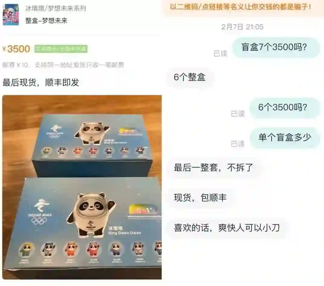 此外,在潮玩族小程序上,也可以看见不少用户正在转卖其手中的冰墩墩周边产品及盲盒。据一位卖家表示,官方售价为118元/个的一组盲盒(6个)未拆价格为3500元顺丰包邮,诚心购买可小刀,溢价近5倍。