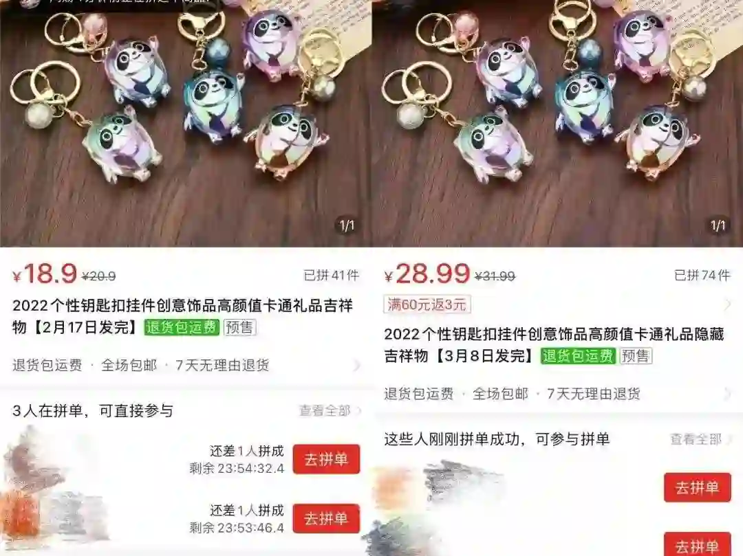 据猎云网通过搜索淘宝、闲鱼、拼多多等平台发现,虽未有冰墩墩转让、代购、溢价转卖等消息出现,但是在拼多多上,仍有个别商家在出售类似冰墩墩钥匙扣等周边产品,售价在十几元到几十元不等,客服表示“并非官方正品”。