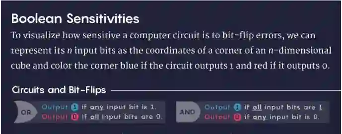为了可视化计算机电路对位翻转错误的敏感程度,我们可以将其n个输入位表示为n维立方体的坐标,例如,四个两位字符串00,01,10和11对应于二维平面中正方形的四个角:(0,0)、(0,1)、(1,0)和(1,1)。同样,八个三位字符串对应于三维立方体的八个角,以此类推到更高的维度。反过来,布尔函数可以被认为是用两种不同颜色着色这些角的规则,如果最终输出为1则将立方体的一角标为蓝色,反之,则标为红色。