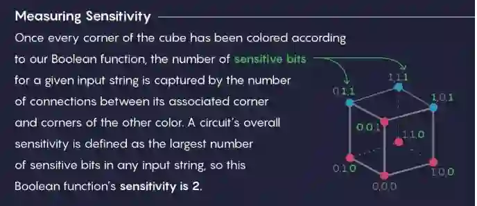 根据我们的布尔函数对立方体的每个角进行着色。给定输入字符串的敏感位数由其相关角和另一种不同颜色的角之间的连接数捕获,电路的整体灵敏度定义为任何输入字符串中最大位数的敏感位。