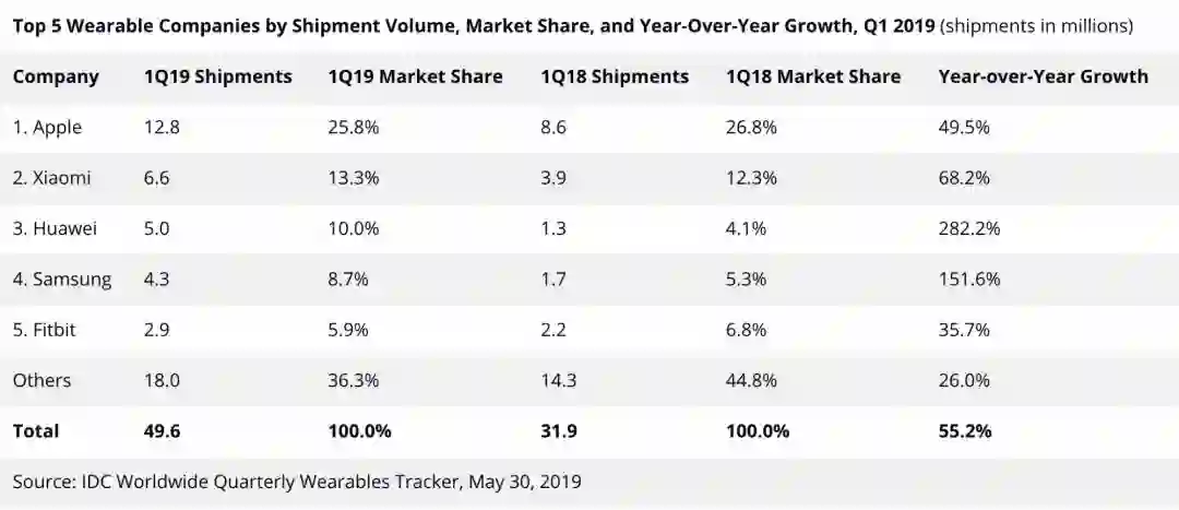 2019年第一季度可穿戴设备增长强劲,华为增幅亮眼