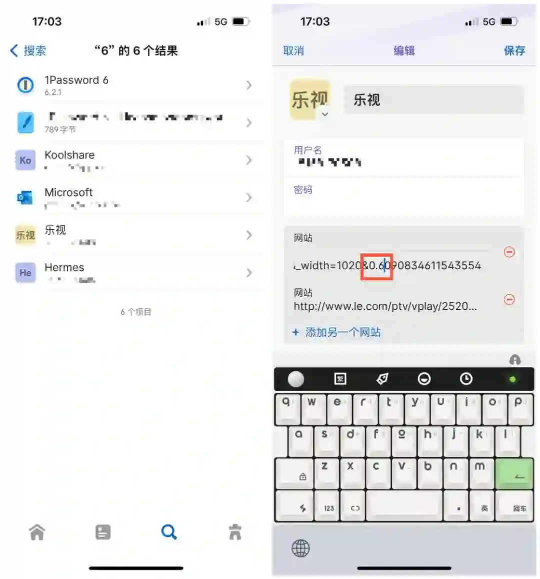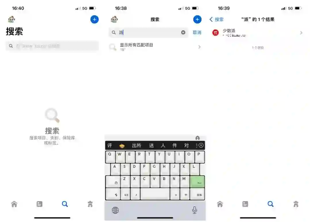 而 1Password 8 移动版的基础搜索功能也和桌面端一样「开倒车」。在 1Password 中我们之所以会使用搜索,最高频的一个场景,大约是只记忆了一部分信息,或是项目名的关键词,或是账号的部分信息等,需要借助搜索引擎调取对应项目。相比几个月前,它或许有了小小的进步,至少在我的设备上,终于可以通过「派」字查到「少数派」,但却不能通过「疆」字查到「大疆」,也不能利用「movie」找到 TMDB,这反而让我更厘不清 1Password 最新的搜索逻辑。
