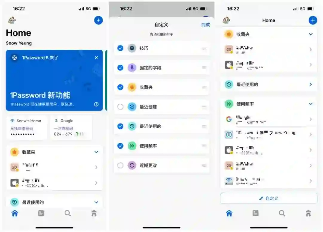 在之前的评测中,我们可以看到 1Password 8 相较 7.x 大幅削减了项目列表的排序规则,「网站名称」「使用频次」「最后使用时间」等排序在新版中均不可用,即使更新至最新版本,这些排序项也并没有被加回来。不过 1Password 8 移动版倒是通过全新的「自定义首页」在一定程度实现了这一需求。