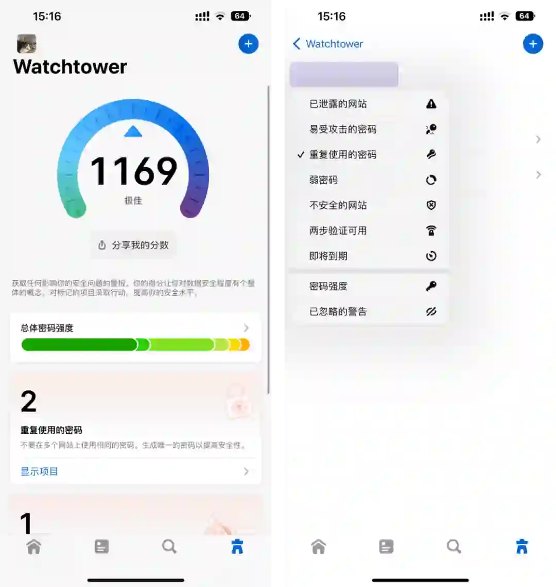 在 1Password 8 之前,瞭望塔风险视图是桌面端的专属功能,移动端你只能在详情页中看到单个项目的风险项。新版则对它非常重视,不仅同步桌面端更新了完整的瞭望塔功能,甚至为其单独开辟了一屏,点击底部抽屉的瞭望塔按钮即可进入。应用会自动计算你的风险指数,并清楚地罗列出各类风险项和涉及的项目,比如「易受攻击的密码」「重复使用的密码」等,让你可以更有针对性地进行处理。如果你是家庭组或商业版用户,还可以在每个风险类别下查看相关成员名单,提醒他们及时跟进。