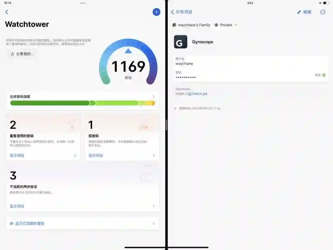 和 Android 版仅为大屏提供更合理的界面布局不同,1Password 8 不仅为 iPad 版提供了与桌面端几乎完全一致的设计,还适配了多任务视图和分屏功能。在 iPad 上长按列表中项目或点击项目详情页右上角「…」,点击「在新窗口中打开项目」,应用会启动分屏,在新开启的窗口中展现项目详情。功能虽好,可我实在没想到有什么使用场景,即使在桌面端我也几乎没有需要 1Password 与其他应用并行的时候,如果你有什么妙用,欢迎在评论区与大家分享。