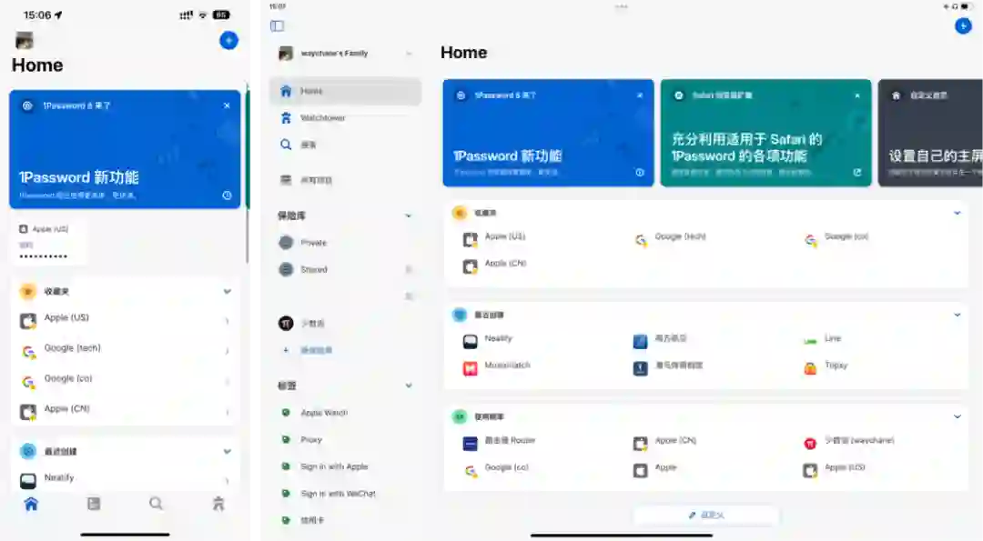 个性化主页让 1Password 移动版在使用体验上已经胜了桌面端一筹,而在其他功能上,开发者也在尽可能缩小二者差距。