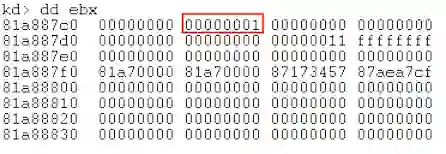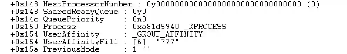 我们要找的结构位于偏移4h(或从KPCR开头处偏移124h)处,它是与当前正在执行的线程相对应的nt!_KTHREAD结构。我们可以转储这些信息:
