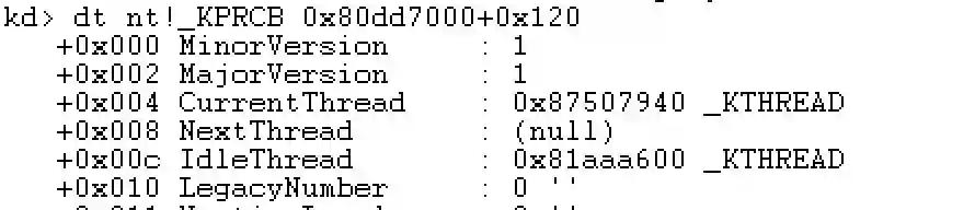 在偏移120h(在_KPCR结构的末尾)处是nt!_KPRCB结构,我们可以通过以下方式进行查看: