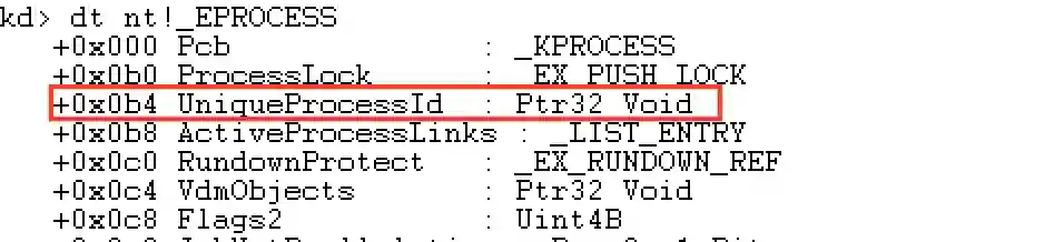对于System进程,我们可以根据该进程的PID通常为“4”这一事实,在偏移量为b4h处的UniqueProcessId属性中进行寻找: