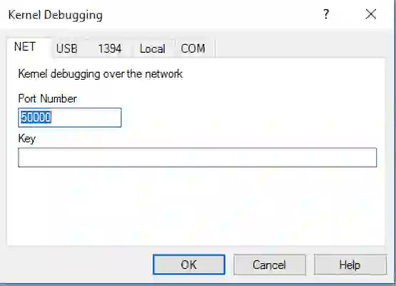 在执行上述命令时,会为您提供一个密钥,当WinDBG在启动过程中连接主机时会用到该密钥。在我们的内核调试主机中,启动WinDBG,并通过“File -> Kernel Debug”来设置内核调试会话,这时会用到上面提到的密钥: