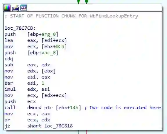 如果我们生成一个16位的应用程序(例如debug.exe),并将我们的漏洞利用代码注入ntvdm的话,在通过nt!WbAddLookupEntryEx对地址0进行写入操作时,系统就不会立即崩溃了。