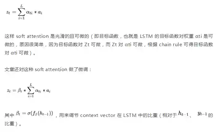 说完“硬”的 attention,再来说说“软”的 attention。 相对来说 soft attention 很好理解,在 hard attention 里面,每个时刻 t 模型的序列 [ St1,…,StL ] 只有一个取 1,其余全部为 0,也就是说每次只 focus 一个位置,而 soft attention 每次会照顾到全部的位置,只是不同位置的权重不同罢了。这时 Zt 即为 ai 的加权求和: