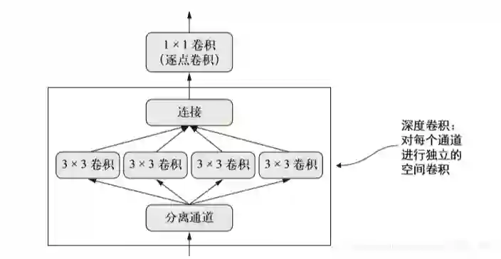 如果我告诉你,有一个层可以替代 Conv2D,并可以让模型更加轻量(即更少的可训练权 重参数)、速度更快(即更少的浮点数运算),还可以让任务性能提高几个百分点,你觉得怎么样?我说的正是深度可分离卷积(depthwise separable convolution)层(SeparableConv2D)的作用。这个层对输入的每个通道分别执行空间卷积,然后通过逐点卷积(1×1 卷积)将输出通道混合,如下图。这相当于将空间特征学习和通道特征学习分开,如果你假设输入的 空间位置高度相关,但不同的通道之间相对独立,那么这么做是很有意义的。它需要的参数要少很多,计算量也更小,因此可以得到更小、更快的模型。因为它是一种执行卷积更高效的方法, 所以往往能够使用更少的数据学到更好的表示,从而得到性能更好的模型。