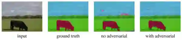 在像素级别尽可能接近,另一方面尽可能使判别器从整体上无法区分它们。下图是一个分割的结果,可见对抗模型得到的结果在空间上更加具有一致性。