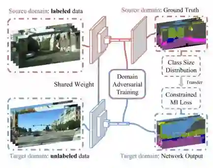 其中第一项是通常的监督学习的代价函数。第二项是对抗学习的目标函数,该函数又包括两个最小化过程,一个是更新特征提取网络,使得从两个域中的图像提取的特征接近从而判别器无法区分,一个是更新判别器参数,是它能尽可能区分两个域中的图像的特征。是一个与特定类别有关的代价函数。其思想是利用从源域中的标记结果中统计出各个类别物体的尺寸范围,再用这些尺寸范围作为先验知识去限制目标域中图像的分割结果。