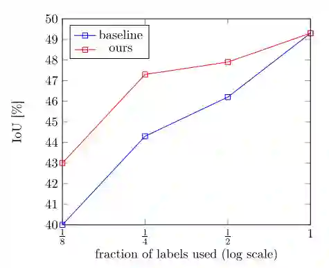 上图是在CamVid数据集上分别使用1/8, 1/4, 1/2 和1/1的标记数据进行训练的结果。相比于蓝线只使用标记数据进行训练,该方法得到了较大的性能提高,如红线所示。