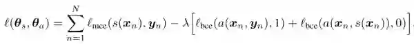 左边是一个CNN的分割模型,右边是一个对抗网络。对抗网络的输入有两种情况,一是原始图像+金标准,二是原始图像+分割结果。它的输出是一个分类值(1代表它判断输入是第一种情况,0代表它判断输入是第二种情况)。代价函数定义为: