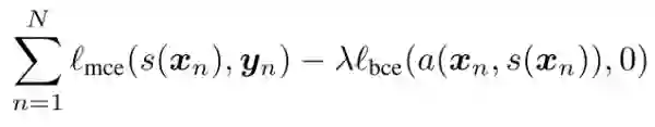 是分割结果。上式第一项是经典的分割模型的代价函数,例如交叉熵(cross entropy)即概率值的负对数。第二项和第三项是对抗模型的代价函数,由于希望对抗模型尽可能难以判别