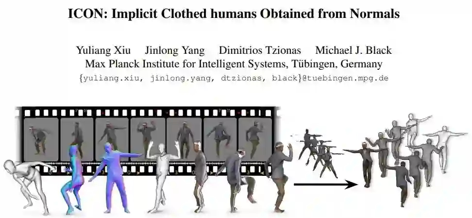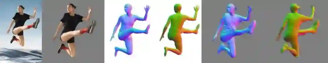 ICON 在思路上借鉴了很多相关工作,比如 PIFuHD 里面的法向图(Normal Image),并和 PaMIR 一样都用了 SMPL body 做几何空间约束。这两个信息都是不可或缺的:SMPL body 提供了一个粗糙的人体几何,而法向图则包含了丰富的衣服褶皱细节,一粗一细,相得益彰。