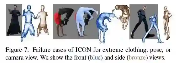 其实原论文及补充材料中对「坏结果」的分析和呈现 (Fig.7 和 Fig.18),已然不怎么遮掩了。虽然 ICON 在量化指标上实现了 SOTA,但对本领域相关研究者而言,「坏结果」往往比「好结果」更能揭示方法的原理和本质。