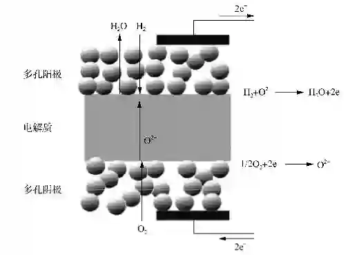 SOFC 主要由固体氧化物电解质、阳极(燃料气电极)、阴极(空气电极)和材料组成。SOFC 的工作原理如图1所示。