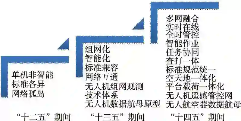 2016年至今的国家第十三个“五年计划”期间,国家科技部扩大了无人机遥感标志性领域和技术的支持。其中,代表性的有中国科院学地理科学与自然资源研究所牵头的重大研发计划项目“高频迅捷无人航空器区域组网遥感观测技术”(2017YFB 0503000),面向需求,突破多元平台组网关键技术,研发集成组网观测硬件设备系统和规划调度与安全管控系统,实现资源优化、规划调度、产品和服务等协同一体的区域组网,构建融合国家野外科学观测台站为无人航空器空港的组网观测体系,具备常态化服务的能力。