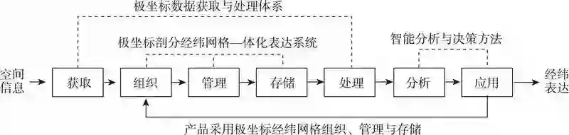 空间信息来自经纬亦应回归经纬。值得探讨的是,以无人机遥感为对象,探索极坐标体系下获取、处理分析、决策一体的处理方法,结合时间分辨率动态度量,避免或减少各个环节中的坐标变换,可以成为兼顾精度、效率的一种新的无人机遥感数学方法。随着公开发行的国军标《地球表面空间网格与编码》(GJB8896-2017),逐步确立了我国空间信息采用剖分经纬网格在数据组织管理上的统一性,其本质是以地心坐标系对地球表面格网进行多层级划分以满足不同分辨率信息的组织管理,更适合于极坐标体制。进一步地,基于经纬剖分格网理论的国家高分重大专项标准《高分卫星遥感信息组织参考框架技术规范》(GFB 30201-2018)为无人机组网遥感信息极坐标处理提供了便利。因此,探索无人机遥感数据极坐标处理与经纬剖分格网组织管理标准二者结合的数学表达,可望形成以极坐标经纬格网、时间分辨率度量为依托的无人机遥感空间信息一体化获取-组织-管理-存储-处理-分析-应用的动态分析应用新体系(图13)。