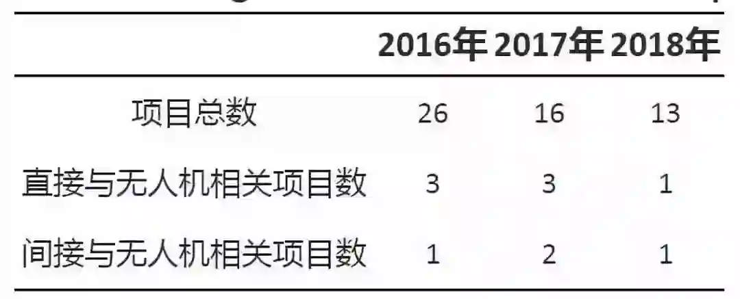 表1是2016-2018年科技部“地球观测与导航领域”重点专项立项的项目有关统计。其中直接与无人机相关的项目有:全空间信息系统与智能设施管理,天空地协同遥感监测精准应急服务体系构建与示范,区域协同遥感监测与应急服务技术体系;高频次迅捷无人航空器区域组网遥感观测技术,重特大灾害空天地一体化协同监测应急响应关键技术研究及示范,国土资源与生态环境安全监测系统集成技术以及应急响应示范;城镇公共安全立体化网络构建及应急响应示范等。2016-2018年间接与无人机相关的项目有:广域航空安全监控技术以及应用;城市群经济区域建设与管理空间信息重点服务以及应用示范,城乡生态环境综合检测空间信息服务以及应用示范;全球综合观测成果管理以及共享服务系统关键技术研究等。