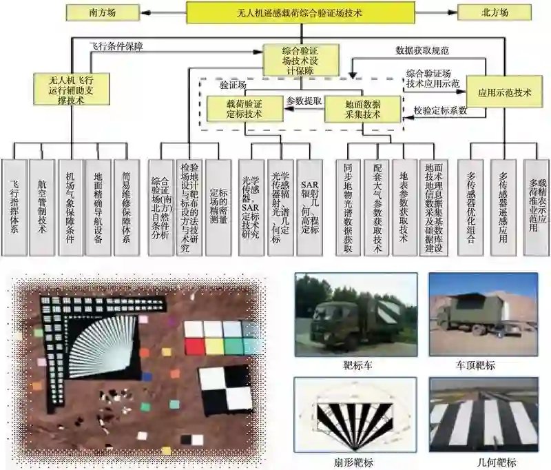 在童庆禧、李传荣、樊邦奎推动下,中国在“十一五”计划期间建设了首个无人机遥感定标场(图4)。作为无人机遥感载荷定标的地面标尺,可用于载荷的精确几何、辐射和光谱定标,厘清了三者之间的交叉耦合关系和理论模型。发明车体移动硬靶标,成为软体靶标退化的校正标尺。实验证明,此定标场实现了不确定度优于6%的光学载荷绝对定标,不确定度优于5%的光学载荷相对辐射定标和不确定度优于0.5 nm的光谱定标,ms量级的同步成像计量及曝光度量。经过精确定标的传感器在农业遥感、测绘应用上也取得了多载荷最佳匹配效率的新方法。